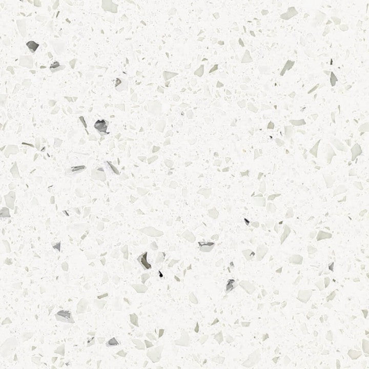 Ammonite Diamond White quartz features a bright white surface with subtle mirror chips that create a sparkling effect. This expertly crafted stone combines durability with a luminous finish, making it ideal for elegant interiors that demand both style and resilience. Its reflective qualities enhance light, adding depth and brilliance to any space.