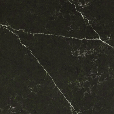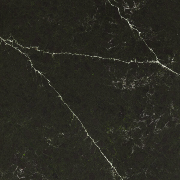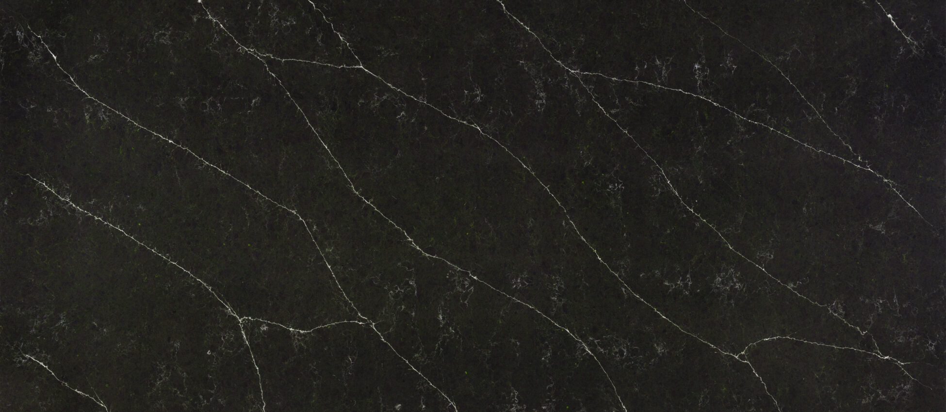 A black/green background with fine grain and long diffused white veins; depth, light contrast and refined texture define this slab.